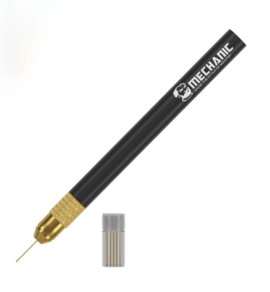 MECHANIC SW-5S je profesionální sada jehel určená pro extrémně přesné nanášení a tažení pájky, navržená speciálně pro práci se zástrčnými konektory FPC, BGA pouzdry a procesy reballingu. Jehly jsou vyrobeny z vysoce čisté mědi s pozlaceným povrchem, což zajišťuje rychlé, rovnoměrné a stabilní přenášení cínu a výrazně zvyšuje efektivitu práce.
