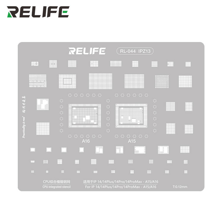RELIFE RL-044 IPZ13 šablona je nezbytným nástrojem pro profesionální servis a opravy elektroniky u mobilních telefonů iPhone 14 řady.