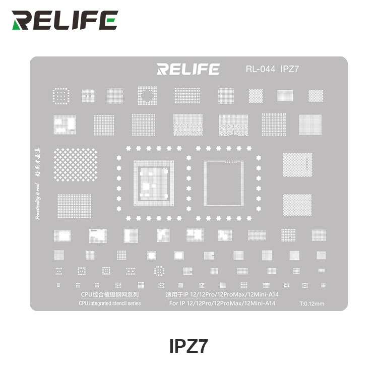 RELIFE RL-044 IPZ7 šablona je nezbytným nástrojem pro profesionální servis a opravy elektroniky u mobilních telefonů iPhone 12 řady.