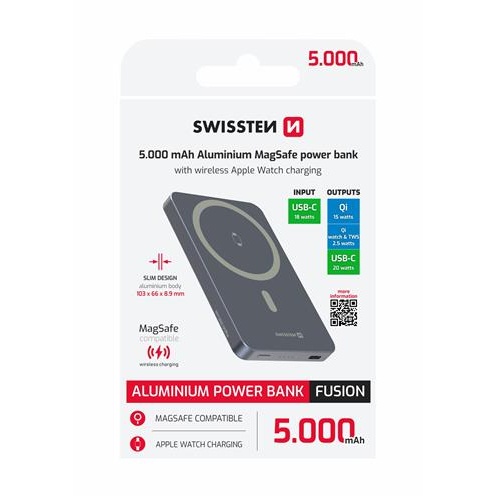 Powerbanka SWISSTEN FUSION 5000 mAh představuje elegantní a praktické řešení pro uživatele iPhone a Apple Watch. Díky technologii MagSafe se snadno přichytí k telefonu a umožňuje pohodlné bezdrátové nabíjení bez kabelů.