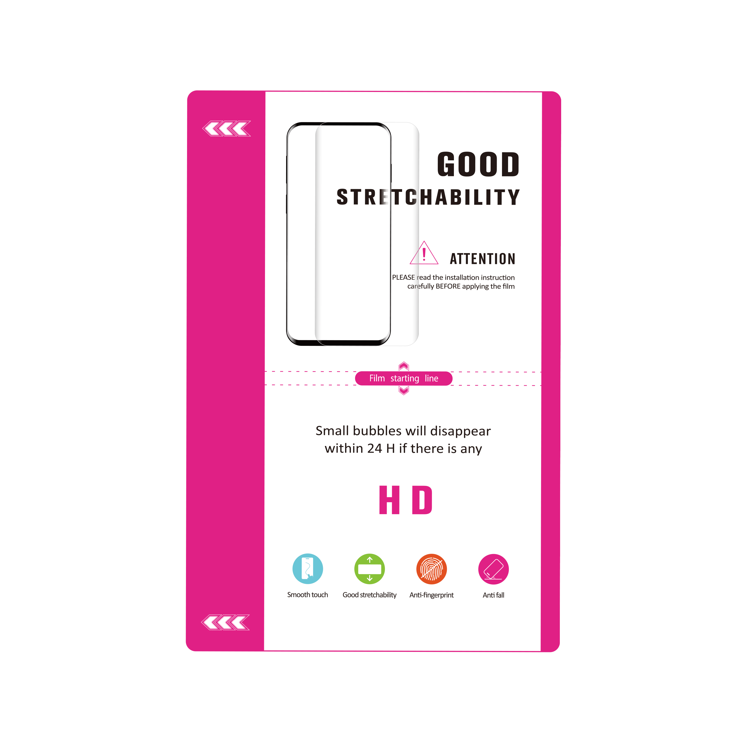 Fólie neobsahuje žádné potisky ani QR kódy, díky čemuž je plně univerálním materiálem pro výřez ochranných fólií pro různé modely zařízení. Formát Narrow Size 180 × 120 mm je optimalizován pro běžné systémy řezacích plotrů a sériovou výrobu fólií pro smartphony.